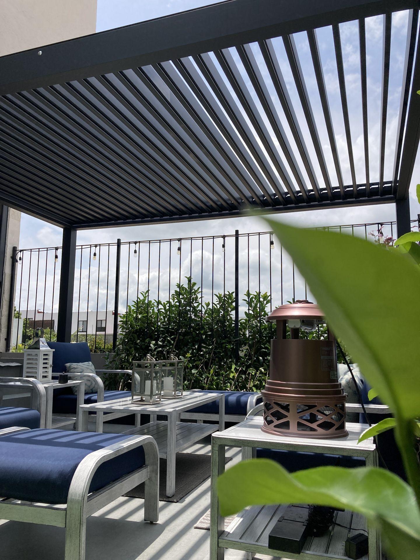 Sus lamas de aluminio orientables te permiten controlar la luz, la ventilación y el resguardo contra la lluvia, además de brindarte protección contra los rayos UV. Su iluminación LED integrada añade un toque de elegancia y funcionalidad.